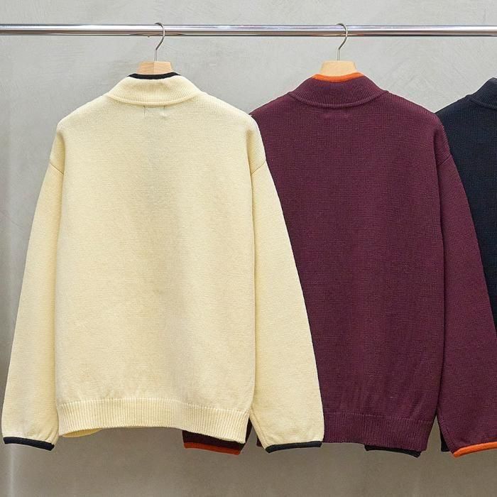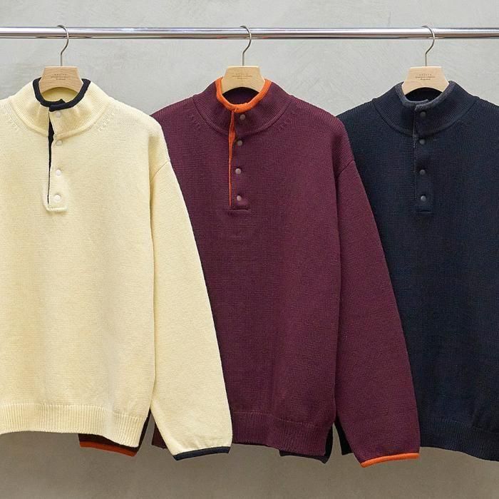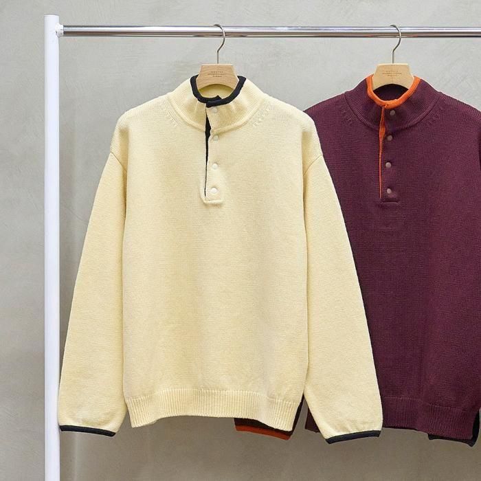 Size 0 Total length (着丈)59cm Shoulder width (肩幅)42cm Bust width (バスト幅)50cm Sleeve Length (裄丈)76cm ※サイズには若干の個体差がございます。 素材 100% WOOL (生地の特徴) 南フランス・アルル地方という標高1500〜3000mの大自然の中で放牧飼育されたフランスメリノ種を原料として使用しています。 通常のウールより非常に膨らみがあり、軽さそして保温性が特に優れています。 バイカラーの襟元にスナップボタンが特徴的なプルオーバーニットです。 アクティブな雰囲気とニットの柔らかな風合いがベストマッチ。 フリースがわりにスタイリングするのもおすすめです。 この商品の問い合わせ先 Filmvak:tel:0992956646 |