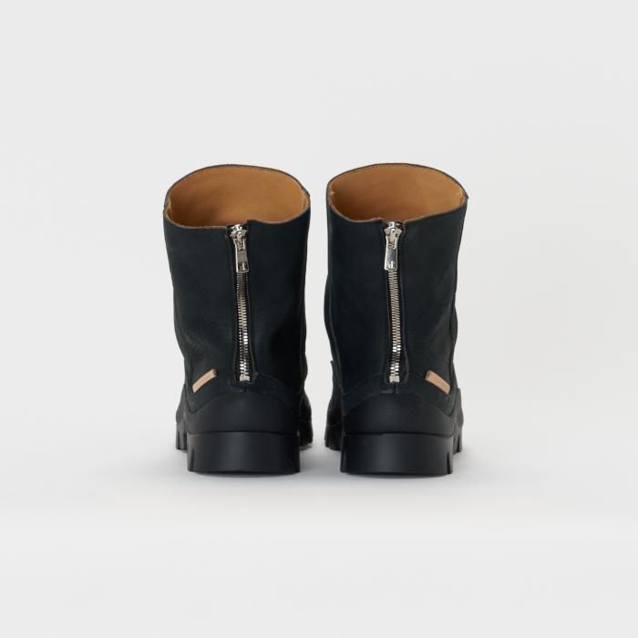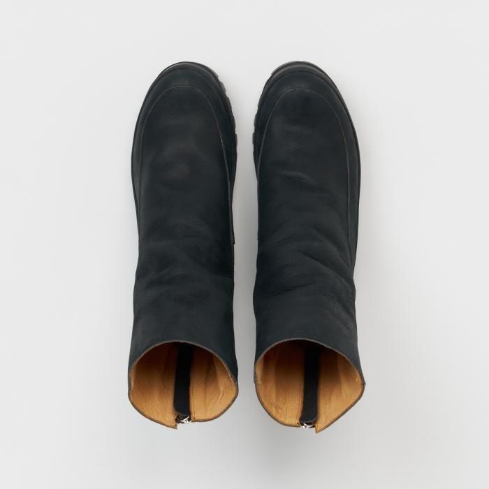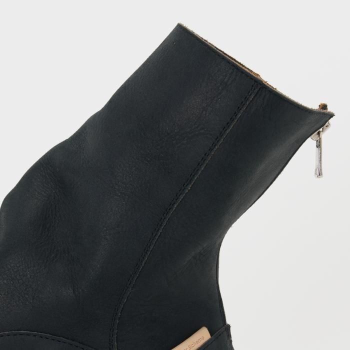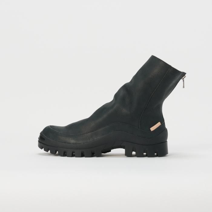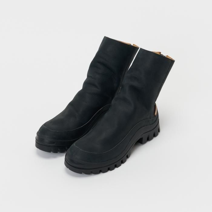 COMMENT 採用しているヴィブラムのカップソールの品番をそのままシリーズ名として掲げた「#2146」ライン の新作は、あえて甲の立ち上がりのポイントを設けず、後方へ倒したまま縫製されたアッパーが特徴の「backzip #2146」をリリース。足を入れることでシャフトが自然に立ち上がり、甲周りに深いシワが生まれる構造のバックジップブーツです。シャフトはやや細めに設計されており、パンツの裾と干渉しづらい仕上がりとなっています。