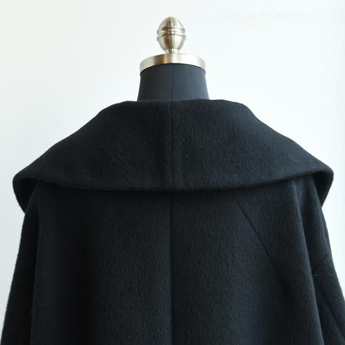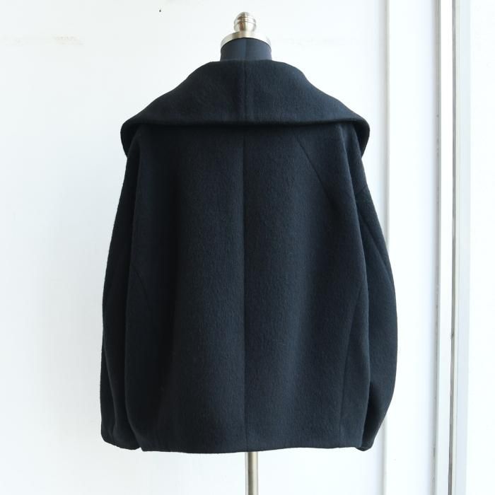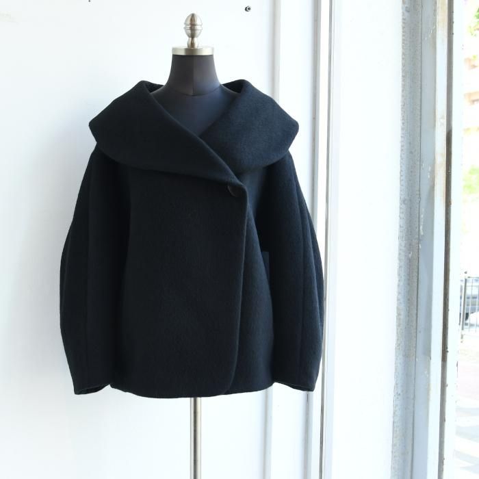 大きな襟と丸みを帯びたフォルムがコンセプチュアルな印象のショートコートです。 紡毛ラムウールとアルパカにモヘアをブレンドした光沢のある糸を使用し、シャギー仕上げのショート丈のコートは、襟裏に隠れた石ころを思わせるシェイプのゴールドボタンを留めることで首周りをふわりと包み込み、1着で多様な着こなしをすることができます。 今季のコレクションムードも伝えながらゆったりとデイリー使いしやすい1着。 【MATRIAL】BODY,WOOL 62%,MOHAIR 16%,ALPACA 15%,NYLON 7% LINING,POLYESTER 100% 【1】着丈:61.9cm 肩巾:61.5cm 袖丈:50.8cm バスト:138.6cm 裾:109.4cm 【2】着丈:63.3cm 肩巾:63.1cm 袖丈:51.5cm バスト:142.6cm 裾:113.4cm この商品の問い合わせ先 Filmvak:tel:0992956646 |